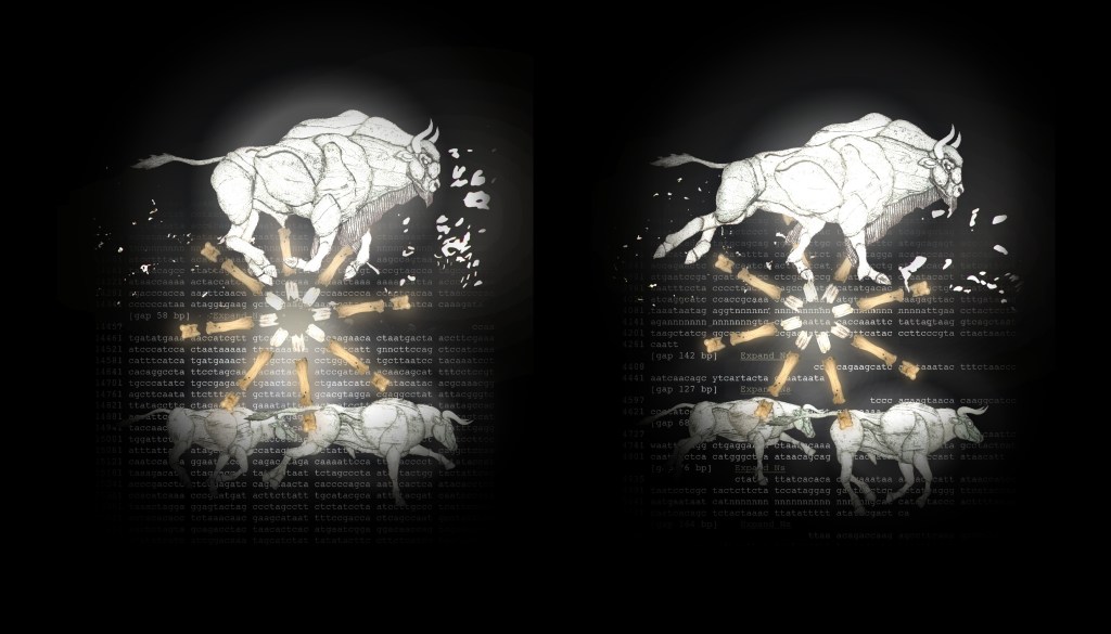 Paper cut-out bison, paper cut-out aurochs, Pleistocene bison leg bones and teeth, ancient bison DNA sequenced from bones found in the North Sea